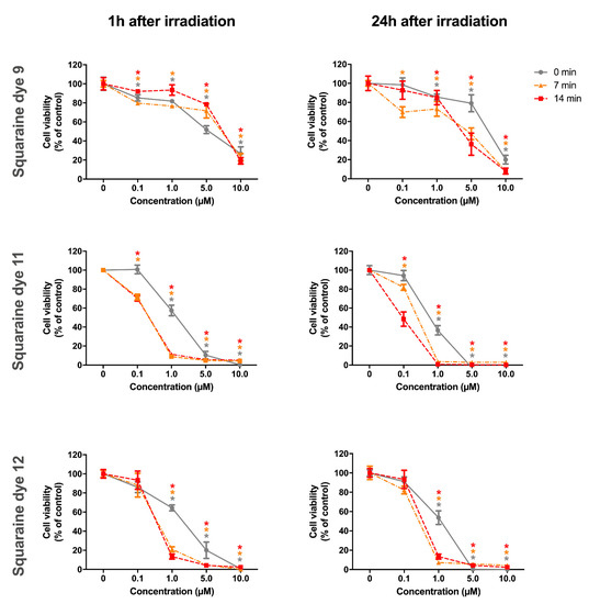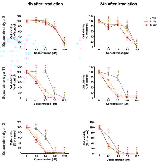 Antiproliferative effects of photodynamic treatment on MCF-7 cells. MCF-7 cells were exposed for 24 h to the quinoline- and benzoselenazole-derived unsymmetrical squaraine cyanine dyes 9, 11 and 12, at indicated concentrations, and then subjected to light-treatment using a light-emitting diode system 0, 7, or 14 min (see methods for details). After contact with the irradiated dyes for 1 h or for 24 h, cell viability was assessed. Cell viabilities are expressed as the percentage of control, non-treated cells (0 μM), and presented as mean value ± standard error of three independent experiments (each one in quadruplicates). Student’s t-test statistical significant treatments related to the non-treated condition (p-value < 0.05) are evidenced by an asterisk (*) of the color relative to the irradiation time.