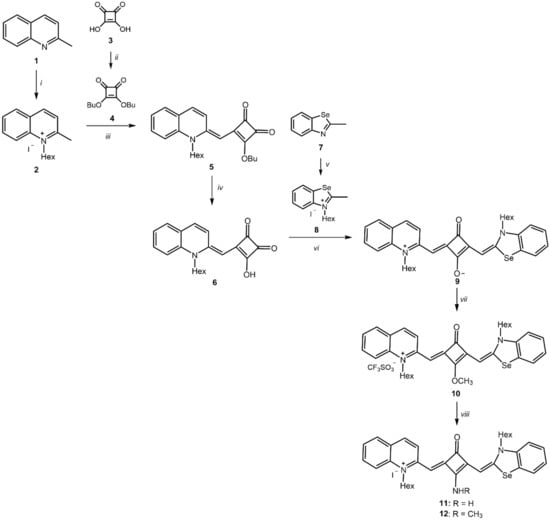 Synthetic routes of quinoline- and benzoselenazole-derived unsymmetrical squaraine cyanine dyes 9–12. Reaction conditions: (i) 1-iodohexane, acetonitrile, reflux (η = 85%); (ii) n-butanol, reflux (η = 63%); (iii) trimethylamine, ethanol, reflux (η = 63%); (iv) 1: sodium hydroxide aqueous solution (40%), 90 °C; 2: hydrochloric acid aqueous solution (2 M) (η = 75%); (v) 1-iodohexane, acetonitrile, reflux (η = 83%); (vi) n-butanol/pyridine (10% v/v), reflux (η = 33%); (vii) methyl trifluoromethanesulfonate, dry dichloromethane, nitrogen atmosphere, room temperature (r.t.) (η = 88%); (viii) 1: ammonia or methylamine solution (2 M), dry dichloromethane, nitrogen atmosphere, r.t.; 2: potassium iodide aqueous solution (14%), r.t. (η = 70% and 67%, respectively).