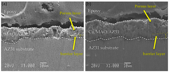 SEM cross-sectional images of (a) MAO/AZ31, (b) Cu/MAO/AZ31.