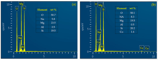 The chemical composition on the surfaces of MAO/AZ31 and Cu/MAO/AZ31 coatings was examined via energy-dispersive spectrometry (EDS) point analysis. The elements of O, Na, Mg, Al, and Si were detected in the MAO/AZ31 coating (Figure 3a). For the Cu/MAO/AZ31 coating, elements such as O, Na, Mg, Al, Si, and a trace amount of Cu were present throughout the coating (Figure 3b). The distribution of Cu2+ throughout the entire coating with a relatively low concentration indicated that the Cu2+ was incorporated successfully into the MAO coating. The Cu concentration was approximately 1.4 wt%, with 0.5 at% in the Cu/MAO/AZ31 coating. The other elements were comparable with those of the MAO/AZ31 coating.