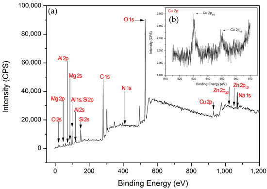 The X-ray photoelectron spectroscopy (XPS) survey scans of Cu/MAO/AZ31 are shown in Figure 5a, and Cu 2p high-resolution scans are presented in Figure 5b. XPS measurements were necessary to understand the chemical composition of the outer layer of the Cu2+-containing coating. The existence of O, Al, C, Mg, Si, Zn, Na, N, and Cu was confirmed from the scans shown in Figure 5a. High-resolution XPS scans of Cu 2p (Cu 2p3/2, Cu 2p1/2) are presented in Figure 5b. The spectrum of Cu 2p in the binding energy consisted of two peaks at 933.2–933.4 eV (Cu 2p3/2) and 953.0 eV (Cu 2p1/2) [22], indicating the presence of Cu (II) [40]. O 1s in the binding energy with the peak at 529.6 eV suggested the existence of Cu–O bond in the form of CuO [40,41,42], and Cu 2p3/2 was mostly responsible for CuO [43]. This result confirmed the successful synthesis of the Cu2+-containing coating.