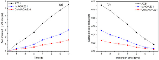 Calculating the H2 volume generation to measure the corrosion rate of Mg alloys in an SBF solution during immersion provides accurate results. While 1 mol atom of dissolved Mg is equal to 1 mol of H2 gas, the quantity of H2 evolution is unaffected by the products of the corrosion on the Mg surface [44]. Figure 7a shows the H2 evolution test analysis of the uncoated AZ31 alloy, MAO/AZ31, and Cu/MAO/AZ31 substrates immersed in SBF for a continuous period. The total volumes of H2 released from the AZ31 alloy, MAO/AZ31, and Cu/MAO/AZ31 after 7 days of immersion were 6.6, 3, and 1.6 mL, respectively. AZ31 displayed the highest corrosion rate, followed by MAO/AZ31, and Cu/MAO/AZ31 showed the lowest corrosion rate. Cu/MAO/AZ31 was well-protected by Cu2+ ions via MAO and not easily destroyed by the aggressive ions in the SBF solution. The rate of H2 released from AZ31 was 0.053 mL/cm2/day, that from MAO/AZ31 was 0.0241 mL/cm2/day, and that from Cu/MAO/AZ31 was 0.0128 mL/cm2/day, which is close to the tolerable level of the H2 release rate in the human body (0.01 mL/cm2/day) [45]. These rates of H2 evolution were calculated using H2 evolution rate (mL/cm2/day) [46]. The H2 evolution rate can be related to the corrosion rate. Figure 7b shows the corrosion rates measured based on the H2 evolution rate by using the formula of CR (mm/year) = K × ∆H2 (mL/cm2/day) that has been explained in a previous report [44]. K should be calculated by converting into
