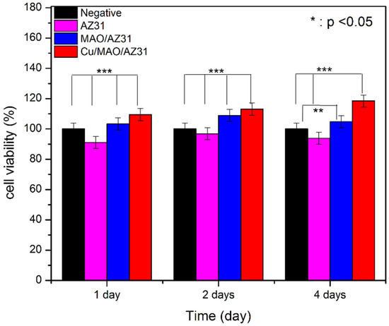 Cell viability of AZ31, MAO/AZ31, and Cu/MAO/AZ31 specimens.
