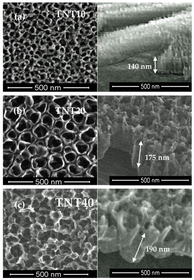 The anodic oxidation method allowed the production of titania nanoporous coatings (TNT10), nanotubular coatings (TNT20) and nanosponge-like coatings (TNT40) dependent on the used potential [35,36]. The morphology and cross-section differences between these three types of TNT systems are presented in Figure 1a–c.