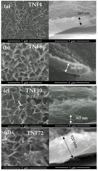 The use of the other etching method, i.e., immersion of substrate samples in 2 M HF and extending the oxidation time to 72 h, caused the rapid thickness increase of the TNF coatings (ca. 920 nm for TNF72) (Figure 2d).