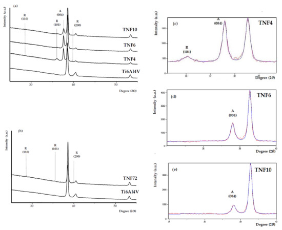 The X-ray diffraction (XRD) pattern analysis of the TNF4–10 samples (Figure 3a) proved the presence of anatase/rutile phase domains in TNF4 (Figure 3c), and anatase examples in TNF6 and TNF10 (Figure 3d,e) [46].