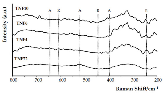 Analysis of the Raman spectra registered for TNF4–10 and TNF72 samples revealed that the clear bands which can be assigned to TiO2 anatase (398, 516, 640 cm−1 [13,48]) or rutile (445, 610 cm−1 [13,49]) were not found (Figure 4). Analyzing the XRD patterns and Raman scattering spectra of TNF coatings, one the differences between the received results was observed. Although Raman spectroscopy is considered a more sensitive method for the structural characterization of titanium oxide materials, in this case the more accurate information was provided by the XRD data. This is closely related with a strict dependence between Raman band intensity and the size of crystallites estimated on the basis of the XRD pattern [50]. Ekoi et al. showed that, in the Raman spectra of TiO2 layers, which consisted of 76 nm size crystallites, the band intensity was very weak (close to zero) [50]. In the case of the TNF72 system, we were not able to estimate crystallites’ sizes from the XRD spectrum, because it was too low, while for TNF4–10 systems, the estimated crystallite sizes were from 37 to 49 nm. These values were below the limit value given by Ekoi et al., and therefore we approached the XRD spectra with greater confidence. Moreover, previous studies have reported Raman spectra of TiO2 samples with very small crystal domains (i.e., around 10 nm) exhibiting quantum confinement effect [51,52]. Therefore, in our case the point to clarify is probably not only the dimension of the nanocrystals themselves, but also their low number compared to the remaining amorphous fraction. Considering the results of the structural analysis (XRD and Raman studies) we assumed that the TNF samples are amorphous and that, depending on the synthesis conditions, they can contain the rutile (TNF72), rutile/anatase (TNF4) and anatase (TNF6, TNF10) phase domains.