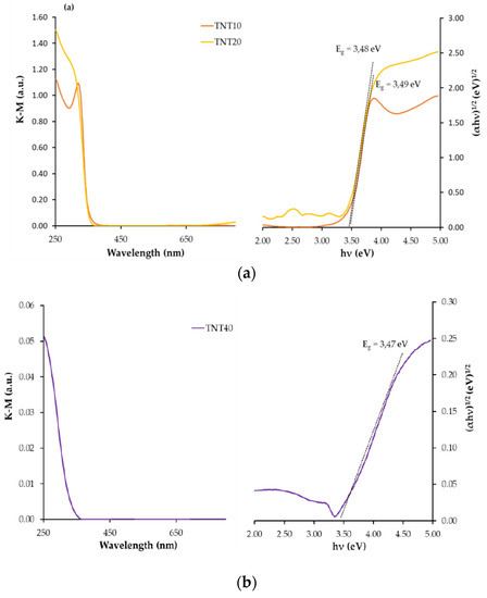 Diffuse reflectance UV-Vis spectra of TNT samples (the left side) and Kubelka–Munk function versus light energy plot for the band gap determination (the right side); (a) TNT10 and TNT20 samples and (b) TNT40 sample.