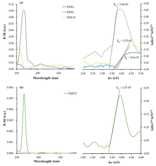 Diffuse reflectance UV-Vis spectra of TNF samples (the left side) and Kubelka–Munk function versus light energy plot for the band gap determination (the right side), (a) TNF4–10 and (b) TNF72.