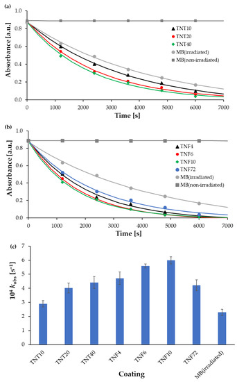 Kinetic runs recorded during MB photocatalytic decolorization with the use of TNT (a) and TNF (b) samples, and calculated observed rate constants (c).