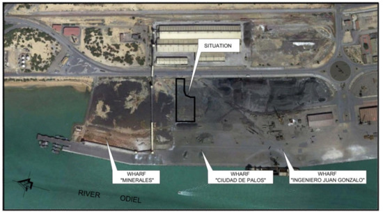 The current research aims to study and evaluate the physical, chemical, and mechanical behavior of recycled concrete aggregates (RA) for their use in a complete real-scale application in structural layers on a loading platform at the port “Ciudad de Palos” in Huelva. This platform is located in the area known as the outer harbor, on the left bank of the Ria Huelva (Huelva, Spain) and has an unpaved surface area of 28,500 m2. An area of 8200 m2 was chosen to develop this research (Figure 1).