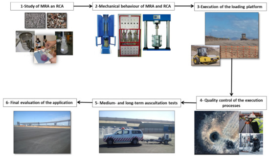 Due to the appropriate mechanical properties of the recycled aggregates for their use in road layers compared to artificial gravel (artificial gravel (AG) is an aggregate of granular particles formed by stone material, it originates from the fragmentation of artificially crushed rocks), the authority of the Port of Huelva decided to modify a part of the structural section of the loading platform called “Ciudad de Palos”. Two layers of AG were replaced by MRA and RCA. To carry out this replacement, characterization studies were initially performed on both RA, and the mechanical behavior was analyzed, comparing their results with AG (conventional materials in road construction).