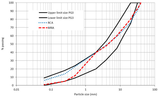 The particle size distribution curves of both materials, RCA and MRA, are represented in Figure 3 together with the corresponding particle size distribution envelope of the artificial axes ZA-0/20 (granular mixtures) as indicated in PG-3 [11]. It can be seen that these curves present a particle size distribution within limits.