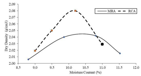 The maximum density and optimum moisture content obtained for the layer built with RCA were 2.08 ton/m3 and 10.2% respectively. The MRA series presented a lower density than the RCA (2.04 ton/m3 and optimum humidity of 10.5%) samples mainly because the MRA showed a lower value of saturated dry surface density with respect to the RCA as shown in Table 2, according to Poon and Chan (2006) [1].
