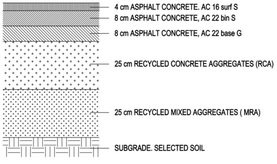 In recent years, RA have been applied in different studies for use on low-traffic roads and paths. MRA are generally used in road layers with reduced structural requirements, such as rural or pedestrian paths [13] and RCA are used in more demanding applications, such as on roads with a higher traffic volume [2]. Commonly, the different types of RA are partially applied. However, it is necessary to use these recycled materials in complete applications, in which all the conventional aggregates applied in structural layers can be replaced by RA to produce a significant reduction in environmental impact, maintaining the appropriate mechanical behavior and bearing capacity with respect to the conventional layers.