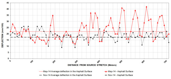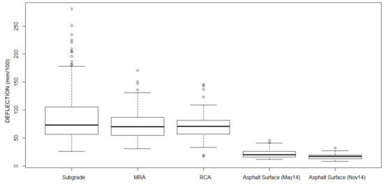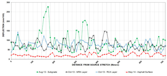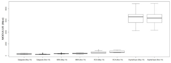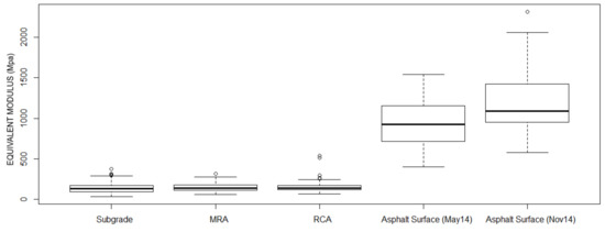 According to the results offered in Table 9, a decrease in the values obtained from the elastic modulus in the subgrade can be seen. A higher amount of rain registered in the area before the November test could be the reason for the decrease in the bearing capacity of this level. On the other hand, an increase of the elastic moduli of the MRA and RCA layers was observed (6.7% and 17.3% respectively), probably due to the cementation of some cement compounds existing in the materials of these layers. The elastic modulus of the asphalt layer has not changed significantly, although there is a slight increase in uniformity as can be seen in RSD values.