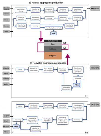 The aim was to check the environmental impact caused by the use of recycled aggregates instead of the methodology used in a traditional construction system. A comparative analysis of the production system used to produce MRA, RCA, and AG was carried out.