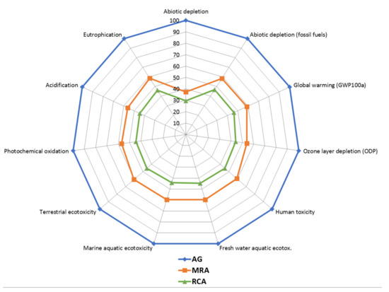 AG production resulted in a greater impact in all categories evaluated. MRA production reduced impacts such as global warming or ozone layer depletion by 41.1% and 45.9% respectively with respect to AG production. This reduction was even greater in the production of RCA, where values for these same indicators were obtained of 53.6% and 55.8%.