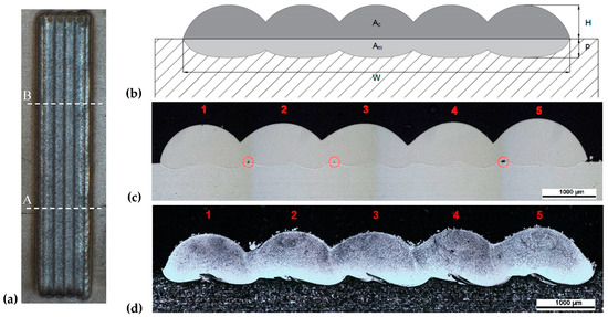 The geometrical characteristics considered in the analysis are shown in the schematic representation of the deposition in Figure 1b. The scheme is compared with a macrographic cross-section images of the depositions (Figure 1c) in which the presence of the flaws at the interface between deposition and substrate are indicated. The macrographic cross-section images of the depositions after etching (Figure 1d) are useful to emphasize the penetration on the substrate of the process. This parameter is of paramount importance because, as it grows, the bond between the base material and the cladding increases. However, the mixing between the two materials also increases, changing the metallurgical and mechanical characteristics of the same. A too low penetration could cause the cladding detachment, while a too high value would compromise the characteristics of the component.