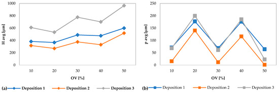In Figure 2a, the Havg and pavg are plotted with respect the overlap percentage of each specimen. The progressively closer depositions cause an increase in the average height of the clad. In Figure 2b it is possible to observe the strong variations of pavg in the depositions with an overlap ratio of 20% and 40% which are derived from the imposed perturbation of the powders flow.