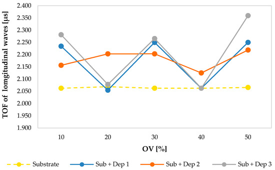 The TOF of the ultrasonic longitudinal waves propagating into the substrate and into the new material resulting by AM process (Sub + Depi, for i = 1, 2, 3) measured for each specimen, i.e., as a function of the overlap percentage of the multiclad depositions.
