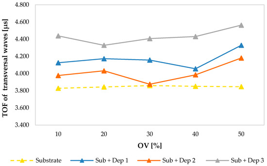 Figure 7 shows the plotted values of the TOF of the ultrasonic transversal waves that propagate in the substrate and in the new resulting AM material in relation to the deposition overlaps (OV) percentage and grouped for each set of process parameters, demonstrating a more consistent trend with a slight growth as OV increases.