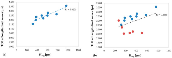 TOFs of the longitudinal waves versus Havg: (a) related to the specimens without deposition anomalies and (b) related to all specimens (including specimens with deposition anomalies in red color).