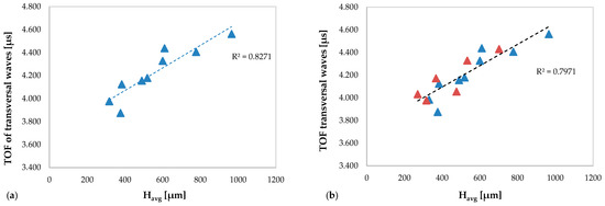 TOFs of the transversal waves versus Havg: (a) related to the specimens without deposition anomalies and (b) related to all specimens (including specimens with deposition anomalies in red color).