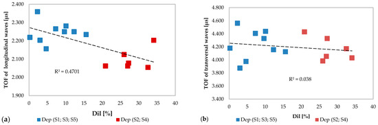 (a) TOFs of the ultrasonic longitudinal waves and (b) TOFs of the ultrasonic transversal waves versus dilution Dil grouped by deposition without anomalies (in blue color) and deposition with anomalies (in red color).