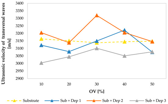 Figure 11 and Figure 12 show the values of ultrasonic velocities of the longitudinal waves (Figure 11) and of the transversal waves (Figure 12) measured in the substrate and in the new resulting material consisting of the substrate and the deposition (Sub + Depi, for i = 1, 2, 3) for each specimen, as a function of the overlap (OV) percentage of the multiclad depositions.
