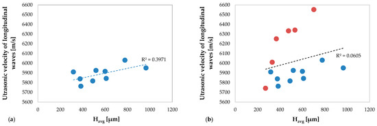The ultrasonic velocity of the longitudinal waves versus average clad height Havg: (a) related to the specimens without deposition anomalies and (b) related to all specimens (including specimens with deposition anomalies in red color).