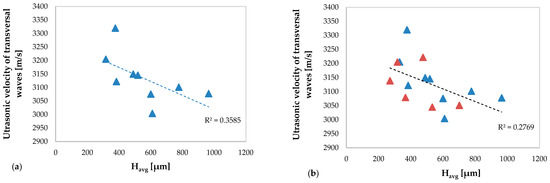 The ultrasonic velocity of the transversal waves versus average clad height Havg: (a) related to the specimens without deposition anomalies and (b) related to all specimens (including specimens with deposition anomalies in red color).
