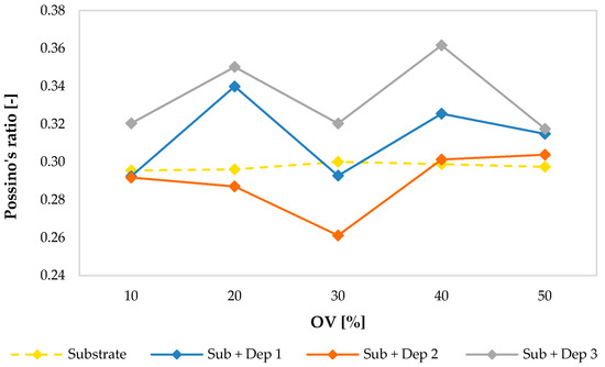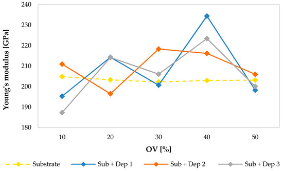 The following graphs show the values of the Young’s modulus (Figure 15), of the shear modulus (Figure 16) and of the Poisson’s ratio (Figure 17) evaluated for the substrate and for the new material consisting of the substrate and the deposition (Sub + Depi, for i = 1, 2, 3) for each specimen, as a function of the overlap (OV) percentage of the multiclad depositions.