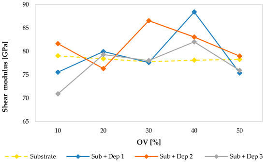 Shear modulus values of the substrate and of the new material (Sub + Depi, for i = 1, 2, 3) measured for each specimen, i.e., as a function of the overlap percentage of the multiclad depositions.