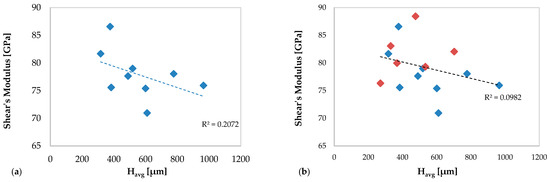 Shear’s modulus values of the new resulting material versus average clad height: (a) specimens without deposition anomalies and (b) all specimens (including specimens with deposition anomalies in red color).