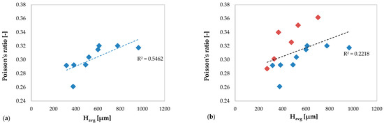 Figure 20 show the correlation between the Poisson’s ratio and the average height of the clad in specimens without deposition anomalies (Figure 20a) and in all specimens (Figure 20b).