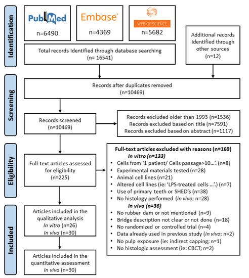 The PRISMA flowchart with the search results and the study selection process can be seen in Figure 1. The PubMed, EMBASE and Web of Science searchs provided 6490, 4369 and 5682 results, respectively. The total sum of 16,541 articles was stored in a reference manager (Endnote X9, Clarivate Analytics). Twelve results found by hand searching through the reference lists of the articles and from other sources were added. Duplicates were removed manually with Endnote X9 (Clarivate Anaytics) reference manager, resulting in 10,469 unique articles. From these 10,469 studies, 1536 were excluded because they were published before 1993 (date of the first publication on MTA [15]). From the remaining 8933 articles, 7628 and 1117 articles were excluded as being non-relevant by screening the titles and abstracts, respectively. Finally, 188 articles were eligible for full-text screening (Figure 1). The year of publication ranged from 1946 to 2020 (later reduced to 1993–2020). The selection process is detailed in the PRISMA flow chart (Figure 1). Two in vivo studies that met de inclusion criteria were finally not included (after contacting the authors) in the qualitative/quantitative analysis because the data had been partially used in previous studies (Figure 1) [112,113]. Finally, 56 articles were included in the analysis, 26 involving in vitro studies and 30 in vivo studies. The reasons for exclusion are listed in Figure 1 and a full list of excluded articles (with reason for exclusion) is provided in Supplementary Table S1 (Table S1). Moreover, these 30 in vivo studies were included for quantitative meta-analysis, among which there were 10 controlled clinical trials (CCT) and 20 randomized controlled trials (RCT). The sample sizes of these studies were n = 355 (premolars) for immature permanent teeth and n = 657 for mature permanent teeth (301 molars and 356 premolars) for a total of 1012 teeth in all 30 included in vivo studies.