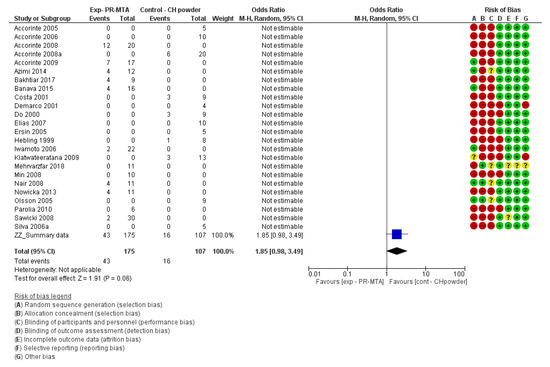 Forest plot and risk of bias of the studies evaluating the formation of a complete reparative bridge comparing calcium-hydroxide powder (CH powder) with Pro-Root MTA (Dentsply-Sirona) (odds ratio (95% CI), random effects). An “event” was considered the lack of a complete hard bridge after 30 days of pulp-capping.