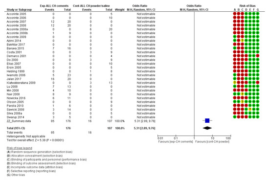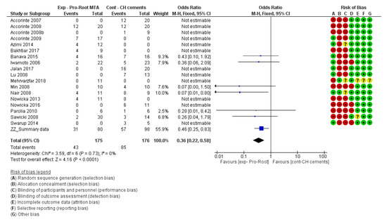 Forest plot and risk of bias of the studies directly comparing Pro-Root MTA (Dentsply-Sirona) to calcium-hydroxide cements (CH cements) for the formation of a complete reparative (odds ratio (95% CI), fixed effects). An “event” was considered the lack of a complete hard bridge after 30 days of pulp-capping.