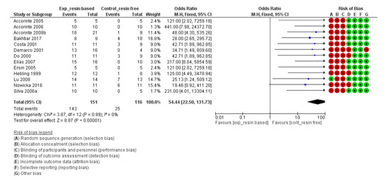 Forest plot and risk of bias of the studies directly comparing the formation of a complete reparative bridge with resin-based and resin-free materials (including pure calcium hydroxide powder, calcium hydroxide cements and hydraulic Calcium-Silicate cements) (odds ratio (95% CI), random effects). An “event” was considered the lack of a complete hard bridge after 30 days of pulp-capping.