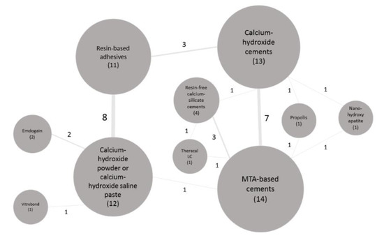 The ability of the each pulp-capping agent to induce dentin-bridge formation is shown in Table 8. Some comparisons between materials did reveal significant differences (Table 8). The most frequently tested materials were: (1) resin-free MTA-like cements within 14 studies [12 studies tested Pro-Root MTA (Dentsply-Sirona) and two studies Angelus-MTA (Angelus)], (2) calcium-hydroxide cements within 13 studies [nine studies tested Dycal (Dentsply-Sirona), three studies Life (Kerr), one study Calcimed (Cerkamed, Stalowa Wola, Poland) and one study Multi-Cal Liner (Pulpdent, Watertown, MA, USA)], (3) pure calcium-hydroxide powder/saline paste within 12 studies and (4) resin-based adhesives within 11 studies [three studies tested Scotchbond Multipurpose (3M, Seefeld, Germany), three studies Clearfil SE Bond (Kuraray Noritake, Tokyo, Japan), three studies Clearfil Liner Bond 2 (Kuraray Noritake, Tokyo, Japan), one study Single Bond (3M, Seefeld, Germany), one study Single Bond Universal (3M, Seefeld, Germany), one study All-Bond 2 (Bisco) and one study Prime&Bond NT 2.1 (Dentsply-Sirona, Konstanz, Germany)]. To have a better overview of how frequently the different capping agents were tested and their interactions, a graphic network analysis is shown in Figure 6.