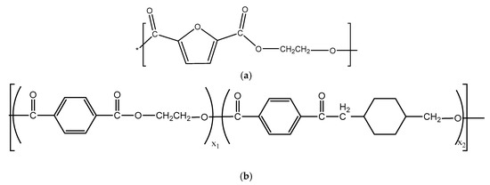 The molecular structures of the PEF and PET-G are shown in Figure 2a,b, respectively, and the total solubility parameters and its components were calculated by using Hoy’s method (Table 1).