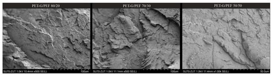 The morphology of PET-G/PEF blends was characterized by scanning electron microscopy (SEM, Hitachi SU-70, Naka, Japan) with an accelerating voltage of 5kV and a working distance of 12 mm. The samples for SEM analysis were cryofractured in liquid nitrogen and subsequently coated (2–5 nm) in a vacuum with a thin gold film before the tests.