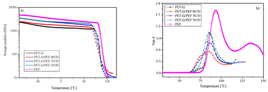 The storage modulus E` (a) and tan δ (b) curves a function of temperature for PET-G/PEF blends.