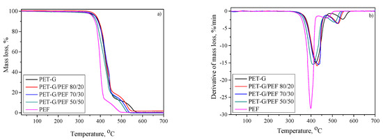 Mass loss (a) and derivative of mass loss (b) for the series of PET-G/PEF blends.