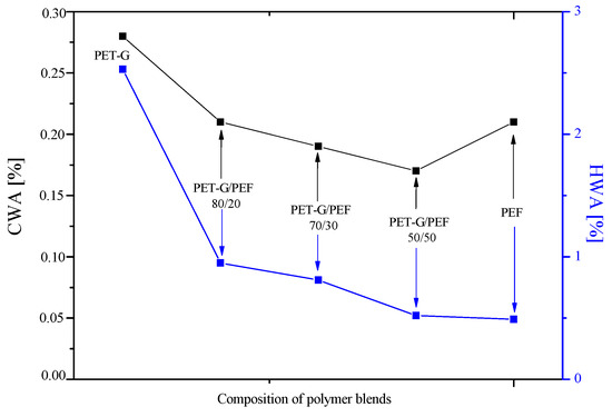 The absorption of water and moisture by polymer materials is governed by several different mechanisms [75,76]: (1) the diffusion of water molecules inside the microgaps or free volume between polymer chains; (2) the capillary transport of water molecules into space between two phases due to the imperfect interfacial bonding between the phases, especially when they are of different polarities and immiscible with each other; (3) and recently, solubility, especially in amorphous polymers of low to moderate hydrophilicity [76]. The results of cold water absorption (CWA) and hot water absorption (HWA) are shown in Figure 9. For each sample, three measurements were performed, and the measurement error is ca. 0.002. It is visible that PEF exhibits a lower value of CWA of about 30% in comparison to PET-G. In the case of PET-G/PEF blends, along with an increase in PEF content, the CWA decreases. The lowest value of CWA was obtained for PET-G/PEF 50/50, and it was lower in comparison to both the neat PET-G and neat PEF. In turn, PEF indicates more than five times the lower value of HWA compared to PET-G. More importantly, PET-G/PEF blends show comparable to PEF boiling water absorption values. It was shown that in PET-G/PEF blends, along with the increase in PEF content, the absorption of boiling water significantly decreased by 60 to 80%, for the blends containing 20 to 50 wt. % PEF, respectively. Burgess et al. [23] proved that PEF exhibited a significantly reduced water diffusion coefficient of ~5 times compared to PET at 35 °C. The reduction in diffusion coefficient for PEF in comparison to PET originated from the reduction in segmental mobility due to the non-symmetrical furan ring in PEF compared to the symmetrical phenyl ring in PET [22] or PET-G [41]. Nevertheless, significant improvement in water absorption in PET-G/PEF blends can be due to the fact that capillary transport of water molecules into space between PET-G and PEF was limited by the existence of interfacial interactions between phases. Moreover, even though both phases were of different polarities and were immiscible with each other, one could have observed the significant improvement of barrier properties toward the water. These observations may confirm that the blends of post-consumer PET-G foils with bio-based PEF, especially the PET-G/PEF 50/50, might be an alternative to PET used in the beverage contained market and allow the utilization of PET-G foils, and thereby, reduce the waste stream entering landfills.