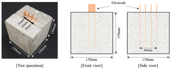 Setting, compressive strength, and splitting tensile strength tests were carried out to evaluate the strength characteristics of all the mixes. According to the method specified in ASTM International, setting test specimen was ∅150 mm × 150 mm in size, and the compressive and splitting tensile strength test specimens were fabricated into cylinders of ∅100 mm × 200 mm [21,22,23,24]. Concrete test specimens for assessing electrical characteristics were 150 mm cubes considering the maximum dimensions of the coarse aggregate, as shown in Figure 2 [4,12]. Copper plates which had dimension of 20 mm × 150 mm were used as electrodes, and four copper plates were embedded in the concrete at intervals of 20 mm. After casting the concrete into the mold, the test specimens were cured in a constant temperature and humidity room with a temperature of 20 ± 1 °C and a humidity of 60 ± 5%. After 14 days, half of test specimens were dried by oven at 60 °C for 72 h to determine the effect of the moisture present in the concrete on the electrical properties.