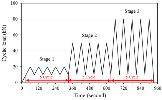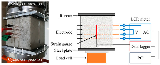 To evaluate the change of electrical resistance with age, the electrical resistance was measured at the designated age using an LCR meter (GWINSTEK, LCR-819, Taiwan, China). In addition, to assess the self-sensing capacity of concrete incorporated with steelmaking slag, a cyclic compressive load was applied to a 150 mm cubic test specimen using a universal testing machine (UTM/MTS, 815, Minneapolis, MN, USA) after 28 days from the casting. The steel plates were placed on both the upper and lower sides of the test specimen so that equal compressive forces were distributed to the test specimen under loading. In addition, to eliminate the effect of steel plates when measuring electrical resistance, an approximately 2-mm-thick piece of rubber that acts as an insulator was placed between the test specimen and the steel plates [4,31]. Concrete surface strain gauges were attached to both sides of the test specimen and self-sensing tests were performed to measure the strain change and the electrical resistance of concrete with repeated compressive loads. The cyclic compressive load was applied in the same way as the previous study [4] on concrete mixed with conductive materials. Three stages of load range were set and five cyclic loads were repeated for each load stage. The repeated loading protocol and test setup of self-sensing under cyclic compressive loads are shown in Figure 3 and Figure 4.