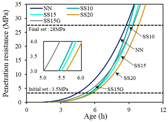 The NN took 4.54 h (272 min) to reach the initial setting and 8.79 h (528 min) to reach the final setting. However, for mixes that contained any amount of steelmaking slag, initial and final setting of all the mixes occurred after 5 and 9 h respectively. As the replacement ratio of steelmaking slag increased, the hydration process tended to be more delayed, which was attributed to the decrease in cement usage due to replacement of steelmaking slag. In addition, steelmaking slag has a lower hydraulicity compared to cement, which is another reason for delay of setting times [16]. For these reasons, initial setting of SS10, SS15, and SS20 occurred 1.05 (63 min), 1.13 (68 min), and 1.28 h (77 min) later than NN, respectively. However, SS15G delayed 0.68 h (41 min) compared to NN, and its initial setting occurred faster than SS10. This is believed to be because the incorporation of gypsum influenced the hydration velocity. The calcium sulfate hemihydrate gypsum used in this study is a soluble gypsum, which easily absorbs the surrounding moisture and is thought to accelerate the hardening speed [32]. It is anticipated that the incorporation of gypsum may partially develop the reduction in the early strength of concrete caused by the low hydraulicity of steelmaking slag. Table 3 shows the test results of initial and final setting by regression analysis and Figure 5 is a representation of the setting behavior of the mixes.