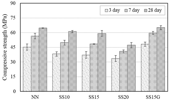 Figure 6 shows the results of compressive strength evaluation according to the replacement ratio of steelmaking slag. At the early age, when steelmaking slag was incorporated, the compressive strength was lowered, and as the replacement ratio increased, the strength difference from NN became larger. It is judged that steelmaking slag has lower hydraulicity than cement, and as the replacement ratio of steelmaking slag increased, setting time was delayed, resulting in a decrease in compressive strength [12,16]. The delay of hydration process due to the incorporation of steelmaking slag was demonstrated through the evaluation of setting time in this study. SS10 and SS15 were measured approximately 60 MPa at 28 days and showed compressive strength similar to NN, while SS20 reduced compressive strength by about 27% compared to NN. On the other hand, SS15G incorporating gypsum showed a different behavior from other mixes with any amount of steelmaking slag, and SS15G showed similar or higher strength compared to NN at all ages. This is because gypsum accelerated hydration and improved strength [33]. As a result, the incorporation of gypsum improved the drop in early compressive strength that occurred when steelmaking slag was incorporated, and the tendency shown in this study is consistent with the results of a study that confirmed that the strength of the concrete containing electric arc furnace oxidizing slag improved through the incorporation of gypsum [16].